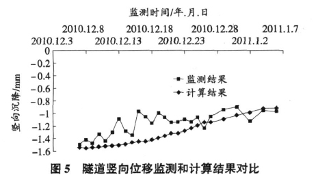 隧道结构收敛变形监测结果如图4所示,隧道竖向沉降监测和计算结果的对比如图5所示,两者比较吻合。可以看出,箱涵周围基坑开挖卸荷造成的盾构回弹位移和收敛变形均较小;盾构竖向位移最大1. 49 mm,收敛变形最大1. 80 mm,两者均满足《杭州市地铁建设管理暂行办法》的要求。可见,在保证盾构结构安全的前提下顺利完成了基坑开挖、箱涵敷设以及回填土的施工。
