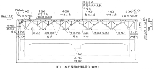 将需要拼装的2 m端构架、两片标准三角通过吊车调放在方木上,逐个销孔进行对位,孔位对准后即安装钢销固定孔位。先安装端构架与标准三角,再安装端弦杆,然后安装标准三角,最后安装水平弦杆,单片军用梁拼装完成。