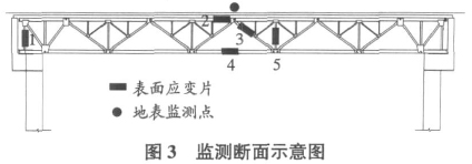 军用梁内力采用表面应变计、振弦式频率接收仪、万用表进行监测。本工程钢便桥共25榀,选取两个断面(分别为第9榀和第18榀),根据军用梁的受力特征,视单榀军用梁为桁架结构,每个断面布置5个监测点,分别为上弦杆、下上弦加强三角中竖杆、端部竖压杆及斜腹杆上,具体布置如图3所示。