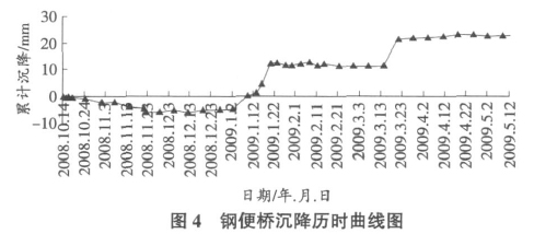 图4为钢便桥沉降历时曲线图,钢便桥跨中沉降主要分6个阶段: