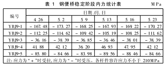 军用梁基本构件和节点连接件的屈服强度不小于210 MPa。由表1可知,各杆件受力小于屈服强度较多;同时,钢便桥沉降最终稳定时,跨中隆起23. 3 mm,处于控制范围之内,所以,钢便桥处于安全状态,设计较保守。