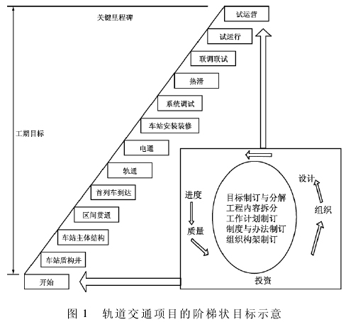总体策划的首要任务是在项目总工期目标的基础上,编制项目的总进度计划,明确阶梯状的里程碑工期目标及关键节点工期目标,如图 1 所示。为了确保总工期目标的实现,必须理顺各个建设工序间的关系,从项目策划阶段、前期工程、实施阶段、建成和试运营阶段这几个轨道交通建设的重要步骤入手,设定关键里程碑作为工期控制的关键节点,通过控制阶段目标的实现而确保总目标的实现。其次,要根据工程概算、工程里程碑目标、工程进度安排以及各年度主要工程内容来确定建设年度资金使用计划,确保资金的落实与工程进度相吻合。