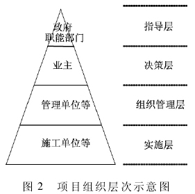 项目组织架构策划就是要根据业主自身的条件及要求,选择需要的参与方,确定战略决策层、组织管理层、项目实施层各层的成员,明确各参与方在项目中的目标和定位及各方参与者职能范围,确立各方相互间的管理、指导关系。如图 2 所示。