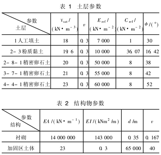 有限元模型采用岩土工程软件PLAXIS建立几何对象采用平面应变模型,有限元网格基于15节点单元。计算土层区域横向取60m,纵向30m。土体采用Mohr-Coulomb弹塑性屈服准则。隧道衬砌与土体的相互作用则是通过在模型隧道表面设置古德曼接触面单元并选取合理的虚拟厚度因子及强度折减因子模拟。模型底部施加完全固定约束,在两侧施加竖直滑动约束,模型表面则取为自由边界,隧道外径6. 0 m,内径5. 3 m,隧顶埋深6. 8 m,根据以往工程经验,此范围能够满足工程研究需要。计算参数见表1、表2。