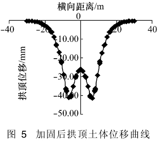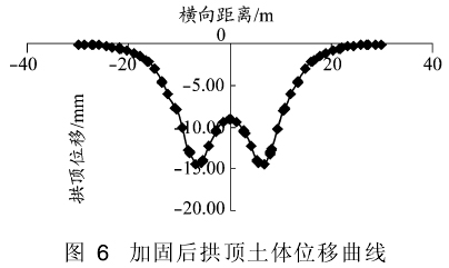 比照加固前后土体位移云图,可以明显看出加固后盾构施工对地层的扰动范围较小,拱顶位移曲线相对平顺,施工采取的技术措施效果明显。