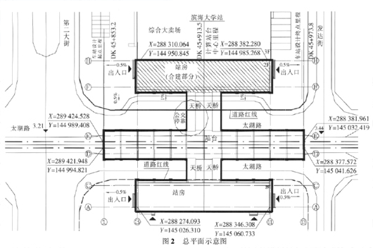 滨海大学站,位于天津市滨海新区第二大街与发达街地段内,沿太湖路基本呈南北向布置。预留车站行车部分位于太湖路上空。太湖路红线宽 40 m。在进行预留车站的方案设计时,周边规划基本已稳定并正在实施,西侧地块内站房紧邻一规划超市。东侧地块内为规划高层酒店,如图 1 所示。