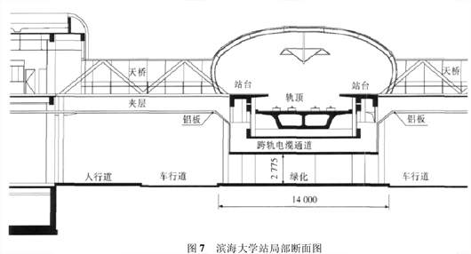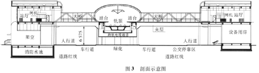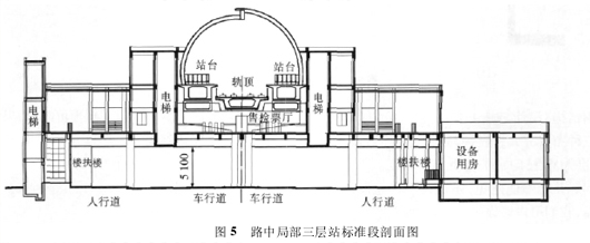 ( 2) 如果考虑压缩路中建筑体量,减少对道路景观的不利影响,可以将设备管理用房集中设于道路以侧,路中站台下仅局部设置售检票厅,厅内设置楼附体设施通向站台。无设备用房的净高要求,线路可适当降低,如图 5 所示。轨面距地约 11. 5 m。