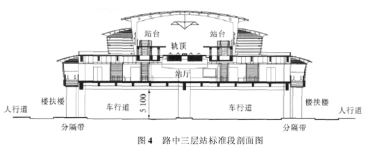 ( 1) 如果用地紧张,可以采用路中三层站,即一层架空,二层设置站厅、三层设置站台,线路整体需要架高,体量较大,如图 4 所示。轨面距地约 12. 5 m。