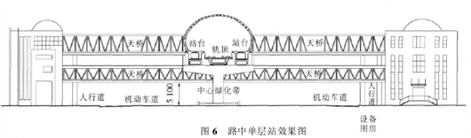 ( 3) 为压缩路中建筑体量,也可以考虑将售检票厅也设置在道路两侧,但通过天桥对售检票厅的非付费与付费区分别进行连通。这种方式近几年采用较多,因路中站台下仅需考虑天桥通过,线路高度可进一步降低。路中可以只设置桥墩,大大减少了对道路断面的影响,但对于抗震设计要求较高的地区需要慎重。如图 6 所示,轨面距地约 11. 0 m。