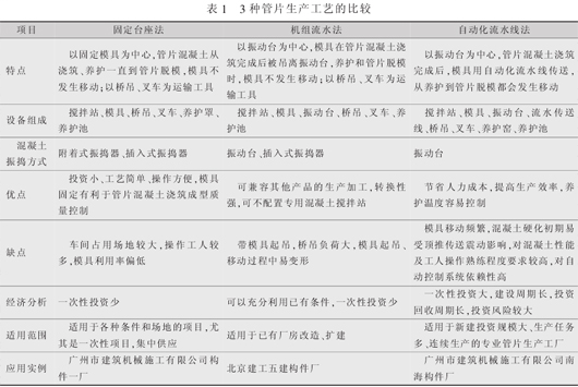 目前国内管片生产工艺按其生产方式可分为3 种,固定台座法、机组流水法和自动化流水线法。 作为专业生产预制管片构件的工厂,要充分考虑工厂的总体规划、总平面布置,并结合投资规模、产量、市场特点、自身情况来选定合适的生产工艺。通过对国内管片生产工艺进行考察研究,笔者总结了3 种管片生产工艺的特点,见表1。