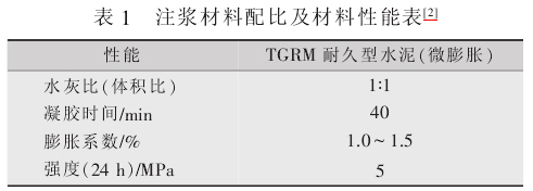 考虑到区间隧道开挖时对地表建筑物(泵房)下沉控制,注浆材料采用TGRM 水泥基特种灌浆料 (该浆液耐久且微膨胀),其性能见表1。