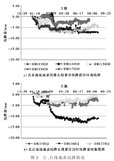 由图3 可知 : 隧道右线 DB (150)J、DB (160)J 和DB (170)J 等 3 个测点,1-9 月份沉降量曲线波动较大,说明3 个测点沉降速率及累计沉降量较大 ,浮动的沉降值为2~-15 mm,沉降量最大值快达到预警值;隧道左线DB(130)D、DB(140)D、DB(150)D、DB(158)D 和 DB(170)D 等 5 个测点,1-9 月份沉降量曲线波动较小,证明 5 个测点沉降速率及累计沉降量较小,浮动的沉降值为2~-8 mm,证明采取深孔注浆措施有利于更好地控制地表沉降及泵站内建筑物的变形,可以确保地面上建(构)筑物的安全。