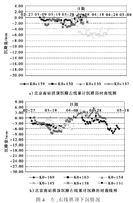 在隧道拱顶处布置沉降点,以便了解和掌握隧道初期支护结构拱顶变形状况,保证施工安全进行。 暗挖隧道拱顶下沉预警值为20 mm,控制值为 25 mm。 区间隧道左、右线拱顶下沉情况详见图 4(左线采用前进式分段注浆施工方法)。