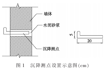 用冲击钻在建筑物的基础或墙上钻孔,然后放入长200~300 mm,直径 20~30 mm 的半圆头弯曲钢筋,四周用水泥砂浆填实(见图 1)。 测点的埋设高度应方便观测,对测点应采取保护措施,避免在施工过程中受到破坏。