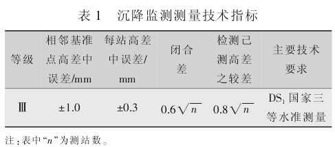 使用全站仪,棱镜、精密水准仪,采用精密水准测量的方法,对地面监测点进行观测。 执行 GB 50308-2008《城市轨道交通工程测量规范 》Ⅲ等变形测量的精度要求[1],监测主要技术指标见表1。