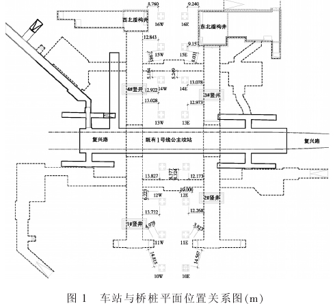 车站主体与新兴桥桥桩平面相对位置见图1。