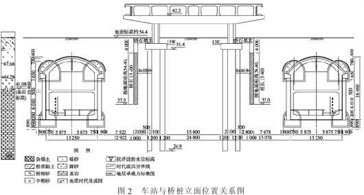 车站主体与新兴桥桥桩立面相对位置见图2。