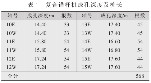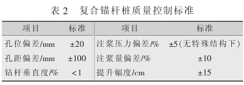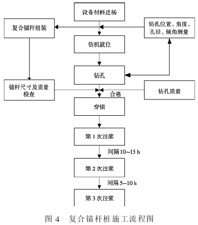 根据单根锚杆桩的直径和长度,用冲击钻机套管跟进成孔,竖向锚杆分段采用接驳器连接,每段长 2 m,简易支撑架吊放,人工配合就位。 复合锚杆就位后,拔出钻孔套管进行注浆。 注浆采用 3 根注浆管。