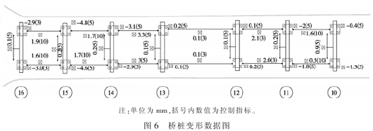 车站双层主体结构施工完成后经监测统计,各桥桩变形数值见图6。