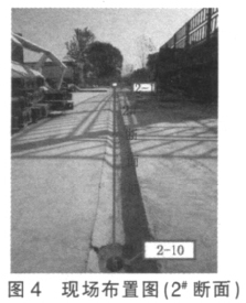在始发阶段,地面监测点布置见上图,为了能够准确的了解地面沉降情况,我们选择 2#断面的监测数据进行分析,因为此点位于盾构施工现场内、点位布置规范、不易受到外界因素的影响,能够客观的反应沉降情况。 2#断面地面情况详见图4。