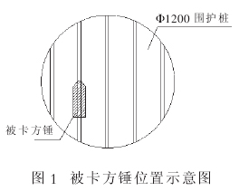 根据施工计划先进行左线始发端头的加固施工, 在该区域连续墙在用方锤修孔时, 锤被卡住。卡锤发生后, 立即采取了清孔取锤的措施, 希望能把方锤取出来。 然而清孔取锤过程中, 泥浆从车站围护桩间流出, 导致已完成的槽段塌孔, 并将方锤埋在地下 15m 深的隧道范围内。 在对漏浆位置进行了处理, 尝试从地面将锤取出的过程中,再次出现了漏浆问题。 为确保工程的安全顺利进行, 由施工单位提出, 会同设计、 监理单位共同审查, 决定将左线连续墙改为两排 Φ400@300 单管旋喷桩, 右线连续墙改为 Φ600@450 旋喷桩,其余加固按原设计, 被卡住的方锤待洞门凿除过程中从洞门位置取出。 被卡方锤位置如图 1 所示。