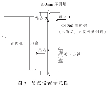 (1) 先在方锤上方的围护桩钢筋上设置两个吊点 (吊点 1、 2), 在盾构机刀盘上设置一个水平拉力点 (吊点 3), 如图 3 所示。 吊点 1、 2 各挂一个 10t 的葫芦, 吊点 3 挂一个 5t 葫芦。