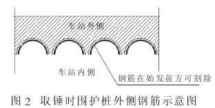 在完成水平探孔后, 采用人工方式凿除围护桩。 凿除过程中, 特别注意围护桩桩身混凝土凿除完成后, 靠近车站外侧的围护桩钢筋严禁割除,如图 2 所示。 此部分钢筋是取锤时的重要安全保障, 必须等方锤取出, 盾构始发准备就绪后方可割除。