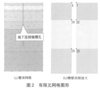 总之,第④层土体较严重的粉砂性和施工机具频繁的扰动,是造成槽壁塌孔的主要原因。为了满足施工安全及质量要求,需对槽壁两侧进行加固。计算分析表明,该措施可有效地避免槽壁坍塌。