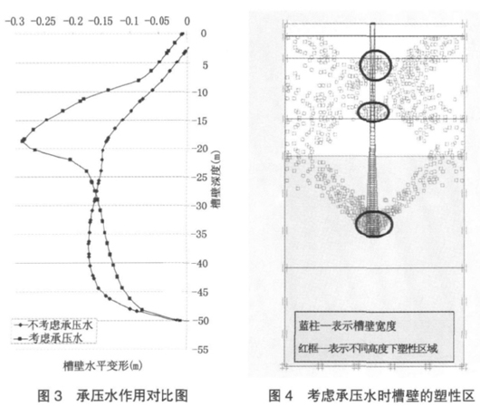 1)分析④层土中微承压水的作用:对比分析不考虑和考虑承压水作用两种情况下,槽壁的水平变形及破坏区出现的规律;
