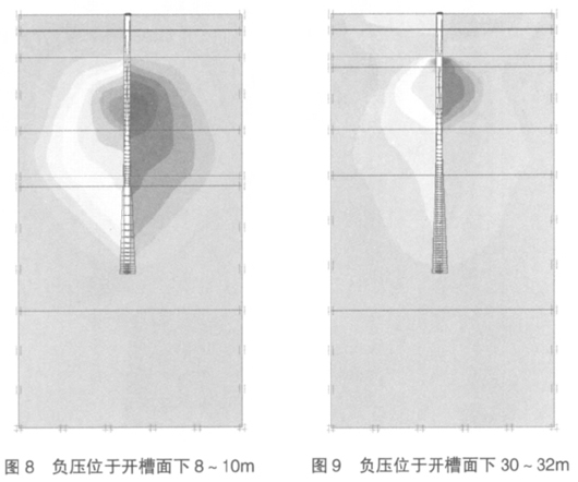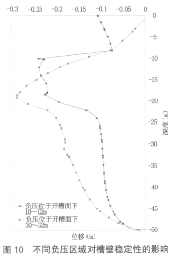 由计算结果可知,当负压产生于开槽面下 8~10m时,负压所在区域产生的位移较大,对该处槽壁的稳定性产生不利影响;当负压产生于开槽面下 30~32m 时,负压所在区域位移虽有所增加,但位移最大值位于第④层土下方位置。两种情况下的位移比较如图10所示。