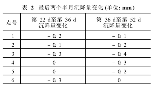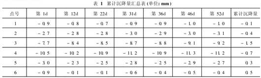 注浆施工历时52 d,共注浆22次。由于点数较多,现选择有代表性的6点,分别记为点1、2、3、4、5、6,间隔为2环(2. 4 m),各点累计沉降量见表1,最后两个半月的沉降量见表2,第1 d和第52 d隧道沉降曲线见图1。