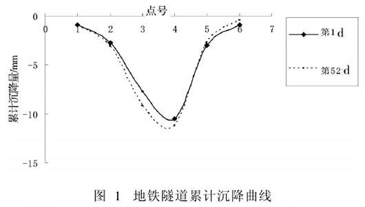 通过对表1、表2及图1的分析,可以看出, 通过压密注浆后,地铁区间隧道基本稳定,累计沉降量变化较小,最大累计沉降量为1. 5 mm(平均日沉降量为-0. 029 mm);最大隆起量为0. 5 mm。表2反映了从第22 d至36 d半个月累计沉降量最大为0. 3 mm,从第36 d至第52 d半个月累计沉降量最大为0. 4mm。根据上海申通集团颁布的《注浆指导意见》中“持续一个月每半个月沉降量不大于0. 5mm”的规定,可以认为该段地铁区间隧道通过控制沉降已基本趋于稳定。由图1可以看出,第1 d和第52 d地铁隧道沉降曲线基本重合,相差较小,这说明跟踪注浆对维护地铁盾构隧道结构稳定具有重要的意义。