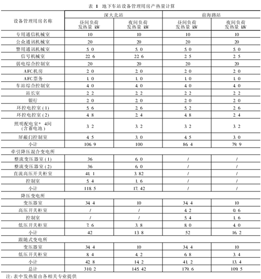 以深圳地铁1号线续建工程中设置牵引变电所、降压变电所以及跟随变电所的深大北站和仅设置降压变电所、跟随变电所的前海路站为例,对其设备管理用房高峰小时计算产热量和夜间列车停运后计算产热量作计算比较和分析(见表1)。