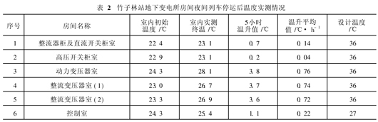 3)夜间列车停运后,地下变电所内即使不通风、关闭空调,其设备产热量引起的室内温升也较小。变压器室温升0. 72℃/h~0. 76℃/h,实测5 h温升<4℃;开关柜室温升0. 04℃/h~0. 14℃/h,实测5 h温升<1℃;控制室每小时温升0. 22℃,实测5 h温升<1. 1℃。故应根据室外气象条件,在设计中进一步核算变压器室、开关柜室夜间采用通风降温的可能性。