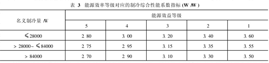 多联式空调机组制冷综合性能系数标志制取单位冷量所需消耗的能量是评价节能性能优劣的主要指标,其系数指标对应于能源效率等级如表3所示。