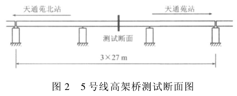 2008年11月5日和6日,北京交通大学和日本铁路综合技术研究所合作,在北京地铁五号线梯形轨枕轨道试验段上进行了现场测试。试验段为跨径3×30 m+3×27 m、总长度为171 m的连续箱梁高架桥。试验段的梯形轨枕轨道铺设在通往天通苑车站的下行方向、普通板式轨道铺设在通往天通苑北站的上行方向。测试断面选在3×27 m跨度连续箱梁中跨的跨中截面,如图2所示。