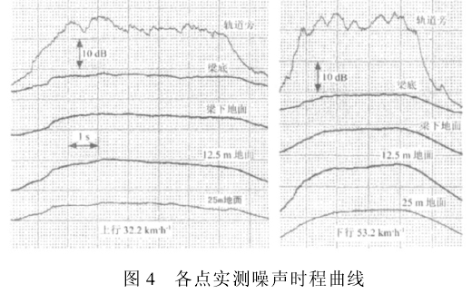 列车通过上行线(普通板式轨道)和下行线(梯形轨枕轨道)时各点用打印机记录的典型实测噪声声压时程曲线如图4所示。
