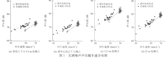 由图4可见,除了轨道旁测点的噪声值超过80 dB外,其余各点的噪声值均在70 dB左右。列车通过梯形轨枕轨道和普通板式轨道时的实测最大噪声随车速的变化如图5所示。