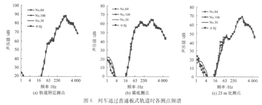 摘 要:通过在北京地铁5号线高架桥梯形轨枕轨道试验段上进行的现场噪声测试,对比分析列车通过梯形轨枕轨道和普通板式轨道时桥梁附近的噪声,研究梯形轨枕轨道的噪声频谱特性及随列车速度变化的规律。测试结果表明:梯形轨枕轨道的降噪能力明显优于普通板式轨道,从时域看,噪声随着列车速度的增加而增加,但是梯形轨枕轨道的噪声值比普通板式轨道低;从频域看,噪声主要集中在60~4 000 Hz范围内,在轨道附近测点和25 m处测点处以1 000 Hz以上的高频轮轨噪声为主,在梁底测点处100~150 Hz范围内的低频结构噪声占很大比重;在1~4 Hz和30~1 000 Hz频域范围内,梯形轨枕轨道的噪声比普通板式轨道平均低6 dB;在4~30及1 000 Hz以上频域范围, 2种轨道的噪声水平相当。