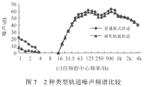 从图7可见, 2种轨道在不同频段内的降噪能力不同:在1~4 Hz频段,梯形轨枕的噪声比普通板式轨道平均低约8 dB;在4~16 Hz频段,二者噪声水平都很低,无明显差异;在16~30 Hz频段,梯形轨枕轨道的噪声比普通板式轨道高约1.5dB。梯形轨枕的一阶竖向自振频率为20~28 Hz,在16~30 Hz频段梯形轨枕可能处于共振状态,因而测试噪声水平较高;在30~1 000 Hz频段,梯形轨枕轨道的噪声比普通板式轨道平均低4 dB左右;在1 000 Hz以上的高频段噪声主要为轮轨噪声, 2种轨道噪声水平相当。这说明采用梯形轨枕轨道不能显著降低频率在1 000 Hz以上的高频轮轨噪声。因此,如果高架桥周围设施对噪声要求较高,可以采用增设声屏障的方法来减小轮轨噪声对环境的辐射影响。