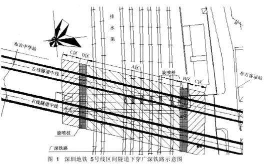 深圳地铁5号线布吉中学站—布吉客运站区间隧道位于深圳市龙岗区布吉镇,采用盾构法施工。在左线隧道DK31+317. 569~DK31+392. 03和右线隧道DK31+320. 316~DK31+395. 259的平面范围内,盾构隧道斜交穿越广深铁路(10股道),隧道与铁路中心线平面交角为77°,穿越长度约58m。隧道在DK31+350处覆土最浅,约为13. 3 m;盾构下穿范围内有2条广深铁路交通涵和排水渠,交通涵与左线隧道平面斜交约38m,距隧道拱顶约8.2 m;排水渠与右线隧道平面斜交约40m,距隧道拱顶约9.5m。区间隧道与广深铁路平面示意见图1。