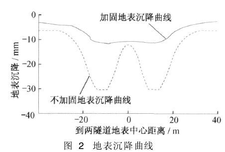 2)经有限元计算分析,得到盾构隧道施工过程中,在注浆加固和不加固2种工况下的地表沉降规律(见图2)。