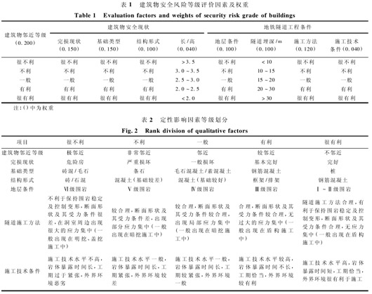 针对邻近建筑物情况,可以采用综合评价法根据表 1,2 进行评价,对于定性指标可以按模糊综合评判的方法进行量化处理。