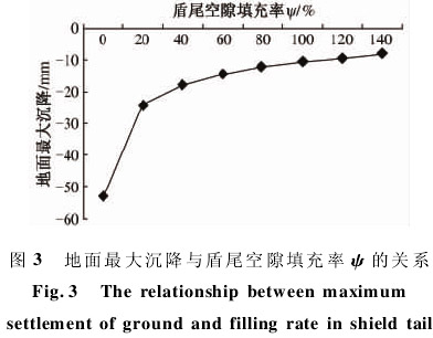 1)同步注浆 采用数值分析获得盾尾空隙填充率与地表沉降的相互关系,如图 3 所示。结合上述结果和以往施工经验,将注浆压力达到规范规定的底线 0. 2MPa,每环的注浆量由原来的 4. 8m3增加到 5. 1 ~ 5. 2m3,达到设计的 162% 。并在浆液中适度增加微膨胀剂,减少同步注浆浆液凝固后的收缩。注浆浆液中各种材料含量(kg/m3):水泥∶ 砂∶ 水∶ 粉煤灰∶ 膨润土∶ 膨胀剂 = 130∶ 800∶ 436∶ 500∶ 60∶ 54。