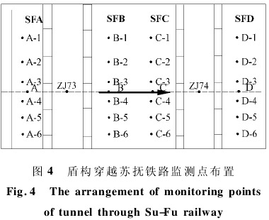 隧道通过苏抚铁路过程中,在该里程范围内共设了 3 个监测断面,每个断面设 7 个监测点,布置如图 4 所示。监测频率为 1 次 /2h,直到稳定。