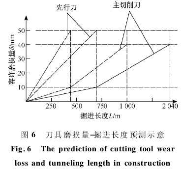 根据刀具种类、刀片材料、地质条件、刀具布置情况等因素,按照以往的经验预测刀具最外周的最大磨损量为 24 ~ 47mm,相应的掘进长度如图 6 所示。预测结果:主切削刀最大掘进长度为 1 020 ~2 041m。该标段盾构隧道段距离为1 197. 4m,基本满足不换刀具进行隧道掘进施工的条件,但需要对刀具进行局部加固处理。在刀盘外周磨损程度较大的部位堆焊了大量的网格状耐磨硬质合金。