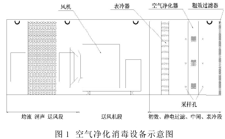 分别在净化器段前后各设置 6 个采样孔,管道两侧各为 3 个,位置见图 1。前采样孔设置在净化器与粗效过滤器之间,后采样孔设置在净化器和表冷器之间,前后采样孔距净化器 20 cm,孔径以插入采样管为宜。采样时,将采样管从孔中插入在采样点处采样,采样点为每个模块的中心位置附近。