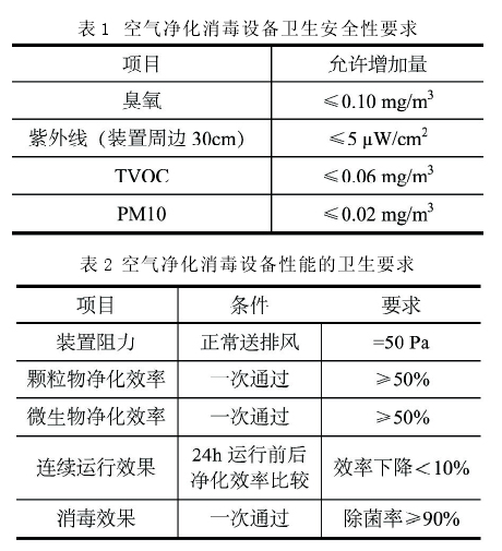《公共场所集中空调通风系统卫生规范》中对于通风系统中的净化设备提出了细致的要求,其中包括卫生安全性能要求和卫生要求,见表1和表2 。依据上述标准,并结合设备实际情况,设置以下检测项目:空气净化装置的内部阻力、颗粒物一次通过净化效率及连续运行效果、微生物一次通过净化效率、臭氧增加量、紫外线增加量、TVOC增加量。