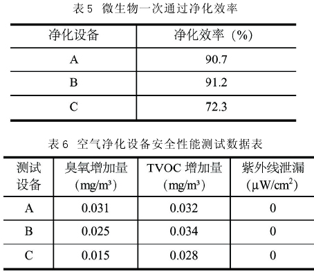 静电式净化器需要使用高压,工作时往往产生臭氧,臭氧是一种氧化剂,对大多数污染物净化效果明显,但是臭氧气味不佳,浓度难以控制,容易引起材料老化,更严重的是会对生理细胞产生危害,引起头晕、头痛、机体免疫力下降。紫外线有杀菌抑毒的作用,但是一旦紫外线泄漏,作用于皮肤上,就会引起光照性皮炎,出现红斑、水泡、痛痒,严重的还会引起皮肤癌,作用到眼睛上,会引起光照性眼炎。另外,有些净化器如果不及时清除过滤的灰尘,运行时会重新释放出颗粒物和一些有机污染物,对环境造成二次污染。在这次检测中,对这些指标均进行了测试,测试结果见表 6。A、B和C三种设备空气净化器都为静电式,并且A和B还配备紫外灯,运行时会产生大量臭氧,但是由于风量较大,臭氧被充分稀释,产生臭氧浓度并不高,远低于标准要求 0.10 mg/m3。同样 TVOC增加量也不高,都低于安全要求。设备周边 30 cm处,紫外线泄漏量均为0 μW/cm2,说明设备的密封性较好,能够满足安全卫生需要,不会对周围人员造成伤害。