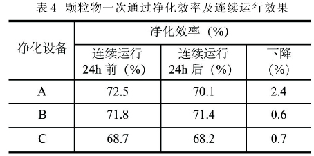 颗粒物一次通过净化效率及24h连续运行效果检测结果见表 4。可以看出,不论是初始净化效率,还是连续运行24 h后净化效率,都超过了标准要求,设备A和设备B净化效率略高于70%,设备C 净化效率略低于 70%。连续运行 24 h 后,净化效率下降值均< 10%,其中 A 设备的净化效率为2.4%,下降最多,可能是因为设备 A 已经安装使用一段时间,设备已经有部分积尘。其他两个效率下降值均<1%,属于正常的波动范围,可见设备对颗粒物净化效果较好,能够满足地铁站通风系统对进风中颗粒物的去除要求。
